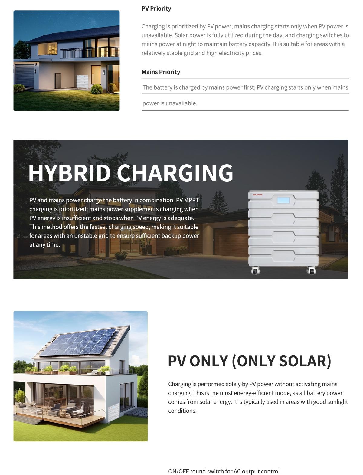 3. Offers 4 selectable charging modes: Solar Only, Mains Priority, Solar Priority, and Hybrid Charging.