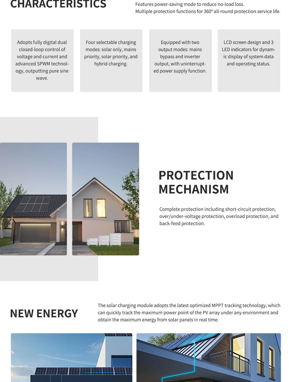 10. Features comprehensive protections including short-circuit protection, over/under-voltage protection, overload protection, back-feed protection, etc.