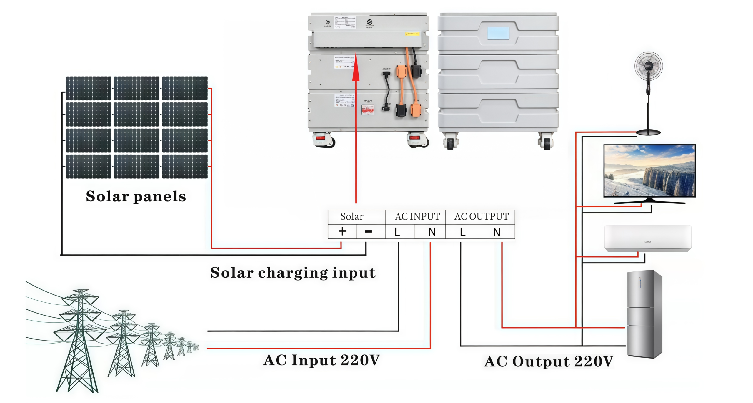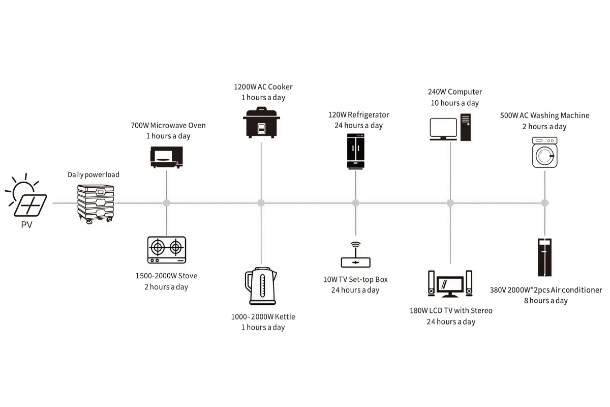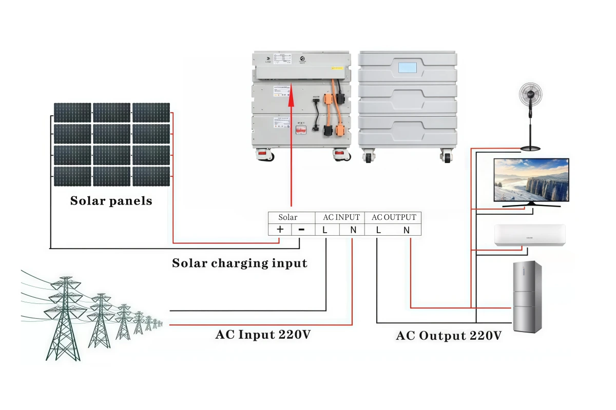 Mains or Generator: Connected to the AC input terminal, it can power loads and charge the lithium battery at the same time. If no mains or generator is connected, the system can still operate normally, with loads powered by the battery and PV modules.